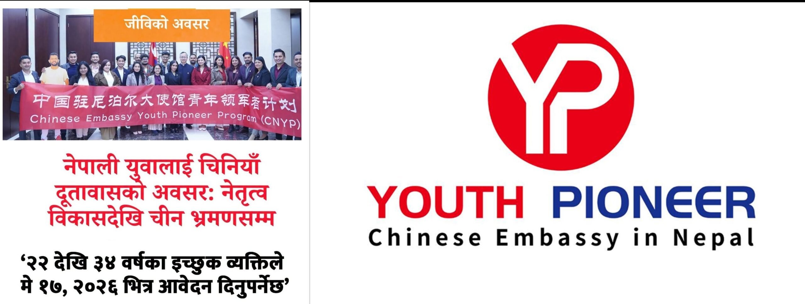 नेपालका युवा पुस्तालाई नेतृत्व विकास, नवीन सोच र नेपाल चीनबीचको जनस्तरको सम्बन्ध सुदृढ गर्न चिनियाँ दूतावासले चाइनिज एम्बेसी युथ पायोनियर प्रोग्राम (सी.एन.वाई.पी.) नामक एक वर्षे कार्यक्रम औपचारिक रूपमा सुरु गरेको छ।