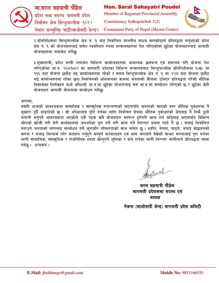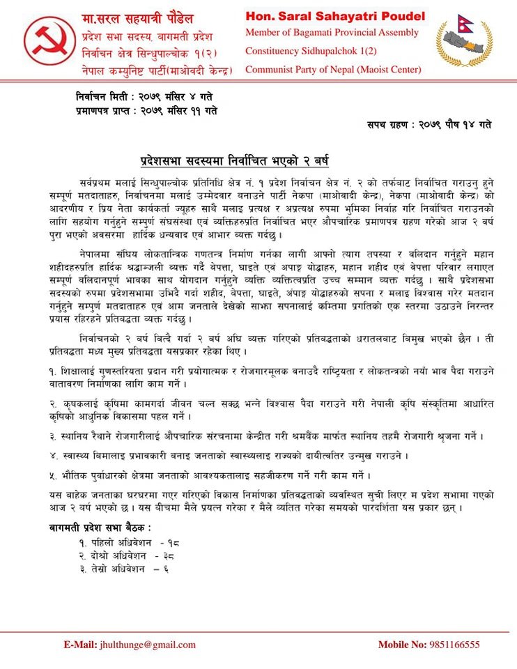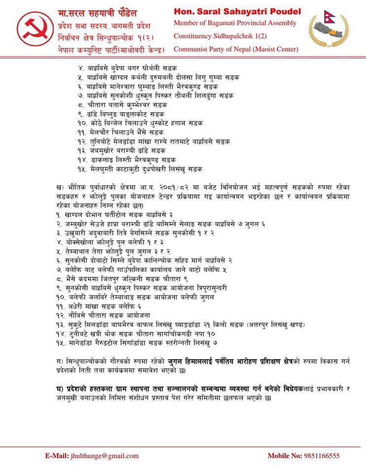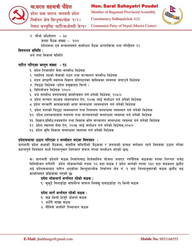 प्रतिवेदनमा नेकपा (माओवादी केन्द्र) का बागमती प्रदेश अध्यक्षसमेत रहेका पौडेलले शिक्षा, स्वास्थ्य, रोजगारी, पूर्वाधार विकास र नीतिगत सुधारलाई आफ्नो प्राथमिकतामा राख्दै जनताको आवश्यकता पूरा गर्न विभिन्न महत्वपूर्ण योजनाहरू कार्यान्वयनमा ल्याएको बताएका छन्।