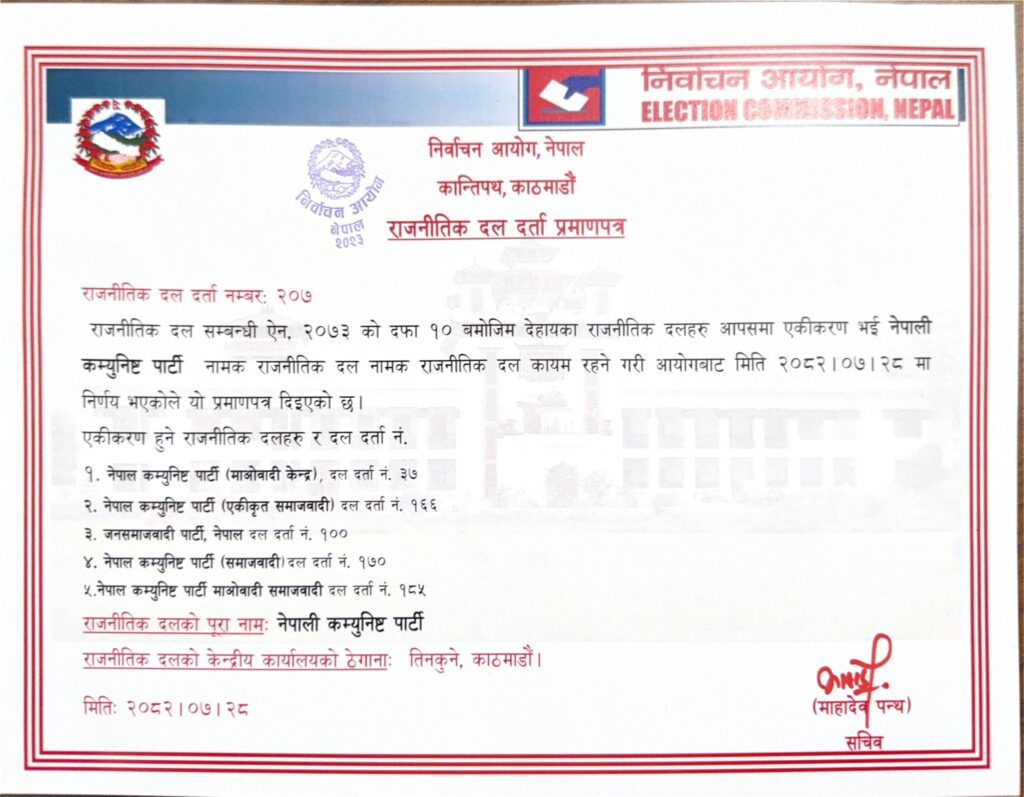 नेपाली कम्युनिस्ट पार्टीले २०८२ कार्तिक २८ गते दल दर्ताको प्रमाणपत्र प्राप्त गरेपछि प्रदेश र जिल्ला कार्यालयहरूमा नयाँ नामसहितको बोर्ड तथा ब्यानर राख्न थालिएको पार्टीले जनाएको छ।